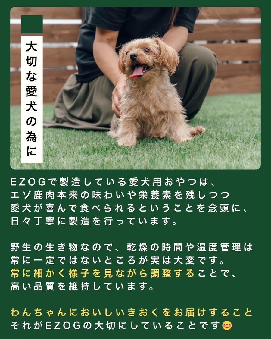 北海道産エゾ鹿肉100%使用!ヒューマングレードのワンちゃん用ドライジャーキーです。